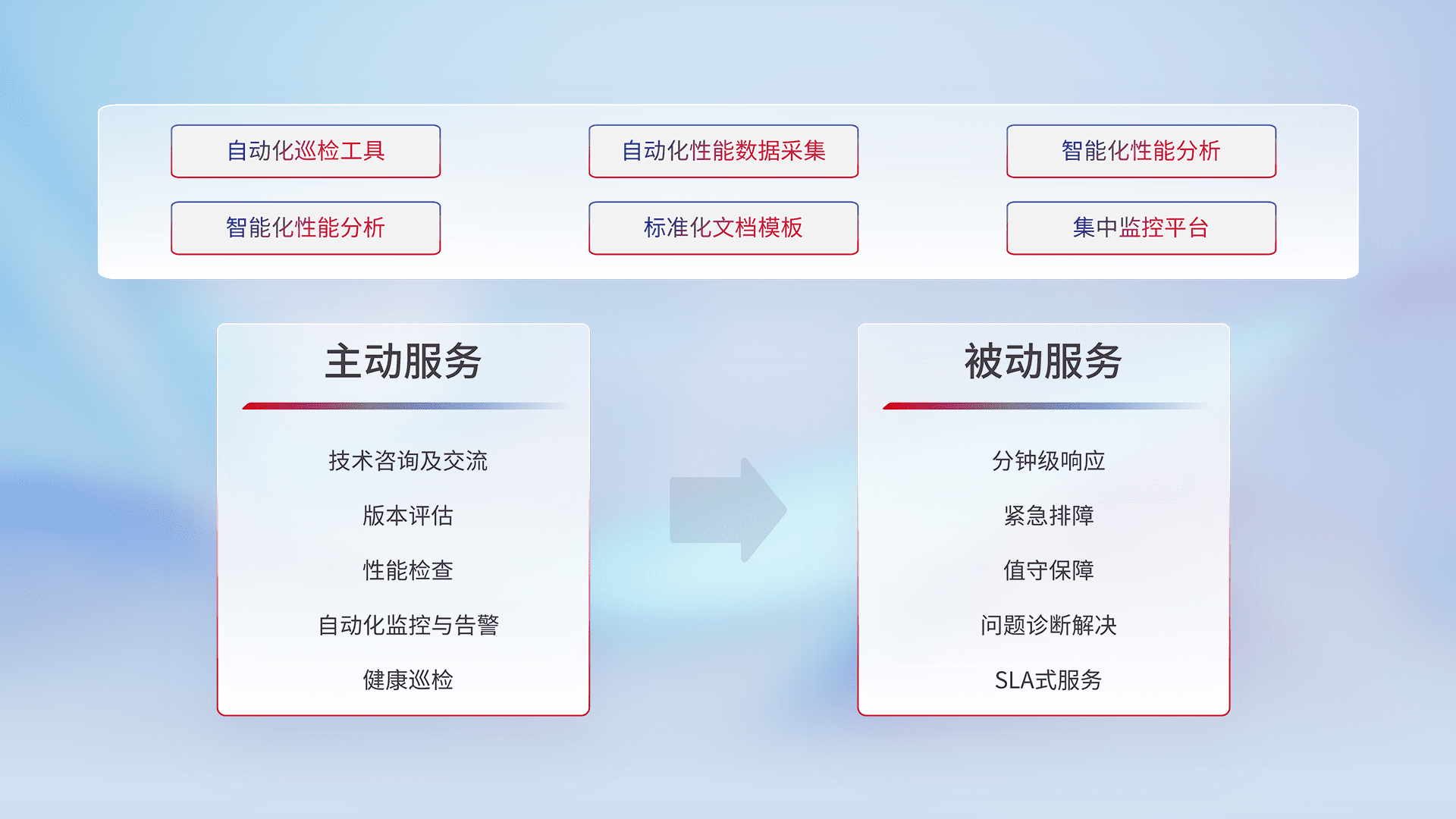 智能化工具和标准化文档,,保障服务质量,,,,提供主动服务(包含技术咨询、、、版本评估、、、性能检查、、、、自动化监控与告警、、健康巡检)和被动服务包含(分钟级响应、、紧急排障、、、值守保障、、、问题诊断解决、、、SLA服务)。。